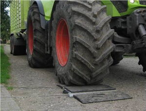 Zwei Wiegeplatten werden mit Schrittgeschwindigkeit achsweise überfahren, Addition der Achslasten zum Gesamtgewicht |